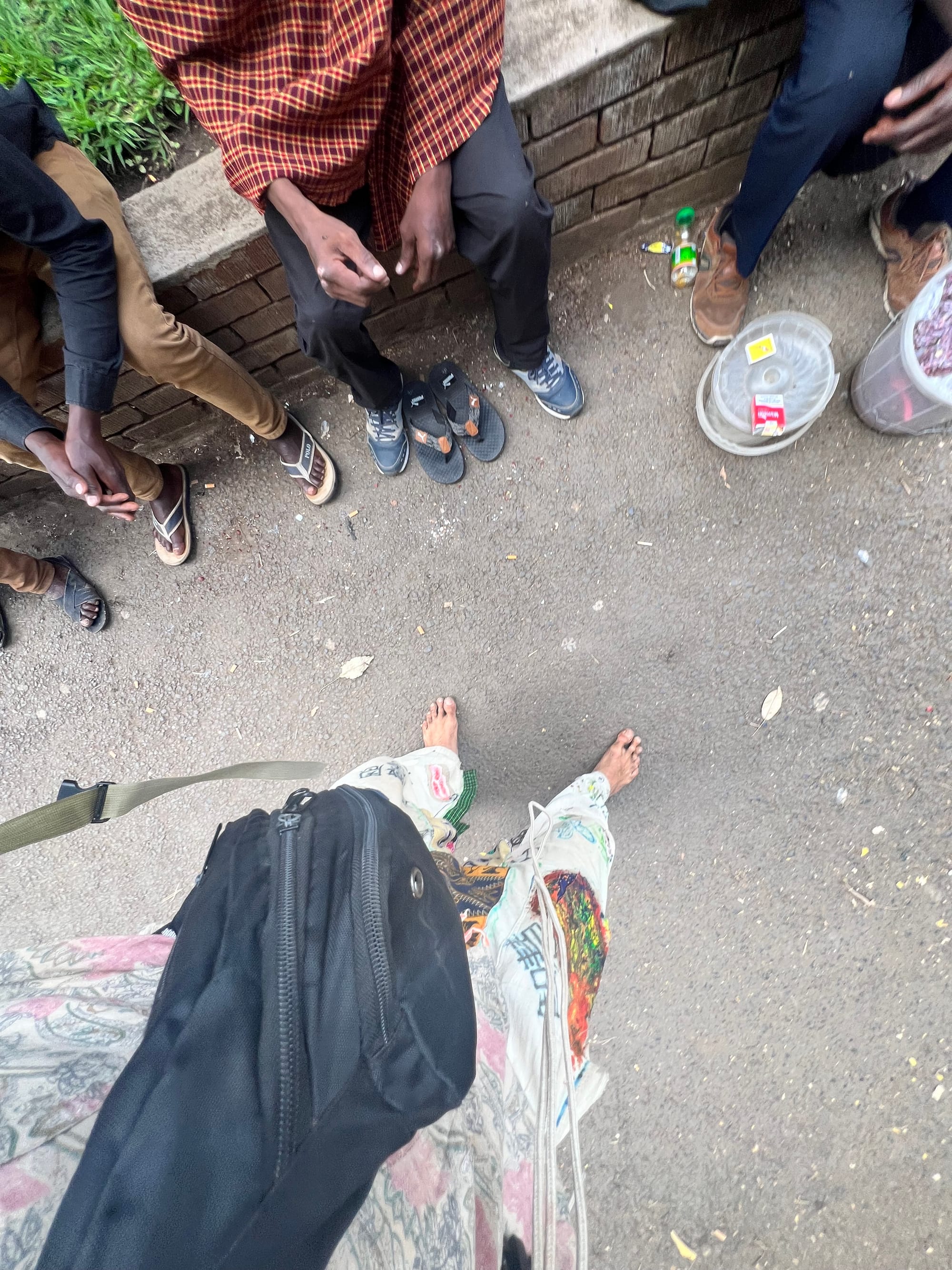 Ich komme endlich an den T2 Highway und überquere ihn hin zu der Bergstraße, die mich für die nächsten Stunden leiten wird. Mein Wasser ging beinahe gänzlich zur Neige und wie gesagt, gegessen hatte ich auch noch nichts. Ahhh… ich weiß ungefähr, dass man beim Reisen umso mehr belohnt wird, je mehr man wartet und Aufwand bringt, aber der Bergweg vor mir ist das unangenehmste Bodenmaterial meines Lebens und die Mittagssonne knallt dermaßen. Ich glaube ich schaffe zwei Kilometer bergauf und grüße unzählige Menschen auf dem Weg. Alle sind happy sich kurz zu unterhalten, aber ich halte mich selbst davon ab jemanden nach Essen oder Trinken zu fragen. Jede einzelne Person hier würde mir helfen. Alle würden mich auf Wasser und ein Mittagessen einladen, da bin ich mir völlig sicher. Aber ich möchte auf eine glückliche Wendung warten und jene wird erst vier weitere Kilometer weiter auf mich treffen. Einmal mache ich eine Pause bei zwei alten Herren auf einer kleinen Bank und ich erzähle ihnen im wundervollen Schatten was ich tue. Dann sitze ich einmal bei einer Apotheke, anscheinend so kaputt aussehend, dass eine Familie kommt. Die Oma der Kinder ist sehr freundlich und barmherzig, ihre Tochter ist ungläubig und die Kinder chillen hinter Mama und naschen Mango. Ich erzähle auch ihnen was abgeht und sie kaufen mir ein Wasser, was mehr als nötig war und ich bedanke mich von Herzen. Die Tochter möchte meine Nummer, um irgendwann sicherzugehen, dass ich sicher und alive bin und wird mich in Zukunft immer mal wieder anrufen und sich nach mir erkundigen. Das mit dem Barfußsein ist keinem bisher wirklich verständlich gewesen… oh, doch einmal. Ich hatte es einer kleinen Gruppe erklärt und von der Verbindung von Erde und menschlichem Körper geredet und ein Mann lief an uns vorbei, hörte das und hielt ohne Umschweife einen kurzen Vortrag in Swahili zu der Gruppe, zeigte mir danach einen Daumen hoch und ging weiter. Vermutlich ein Rasta. Ich traf auf einen Security Guard an einem riesigen Hotel noch weit vor dem Berg und dieser war beinahe schon aufgeregt und bewunderte mich und erzählte von einem Künstler in Tansania, der auch immer barfuß lief und ohne dass ich davon gesprochen hätte, sagt dieser Mann, dass der menschliche Körper und die Erde laut diesem Künstler eine Verbindung hätten. Dieser Mann über den es in dem Gespräch ging, heißt Mrisho Mpoto aus Dar es Salaam, ein sehr berühmter Rastafari aus der Schauspiel-,Comedy-und Musikszene, auf den mich unzählige Menschen ansprechen werden, weil sie sonst nur eine Person ohne Schuhe kennen. Ihn. Und jetzt halt mich. Lenadi aus Ujerumani der in Mwanza kazi fanyat und kwa watoto lebt. Ich denke das geht als Deuhilisch durch…