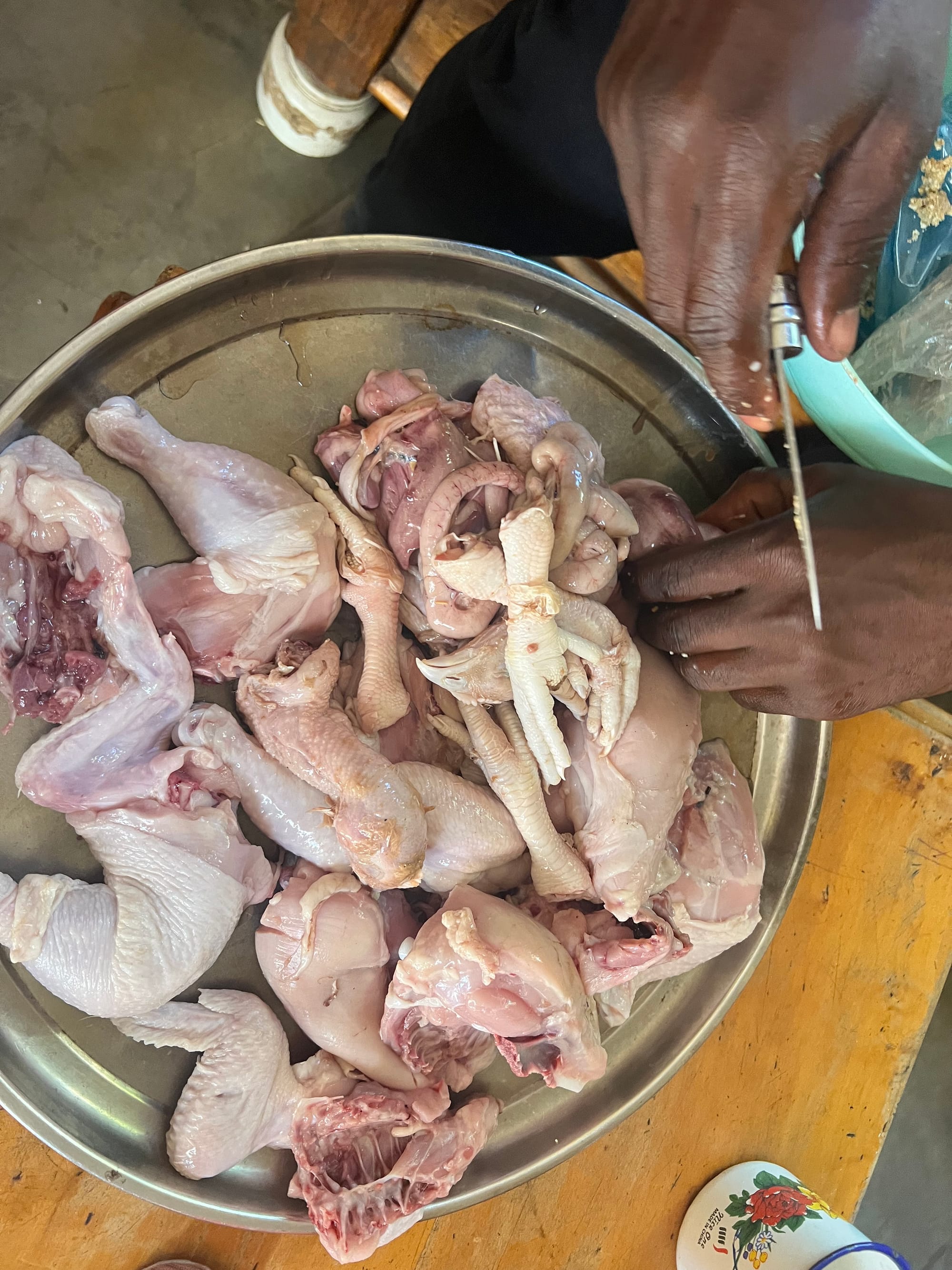 Wieder zuhause bei ihm und die Unmengen an Obst und Essen, die er kaufte, scheinen auch für mich gedacht zu sein. Kiloweise Kartoffeln sollen Pommes werden und ich helfe Mama dabei sie zu schneiden. Ich gebe ihr mein französisches Opinel und sie ist begeistert, und schneide selbst mit einem orangenen stumpfen Messer, wessen Plastikgriff an einem Ende geschmolzen ist. Sie bringt mir die Schnitttechnik bei, wie man die Kartoffel in der Handfläche hält und die Klinge in die Hand drückt ohne sich dabei zu schneiden. Das funktioniert überraschend gut und nur bei einem der letzten Schnitte fahre ich in meinen kleinen Finger und blute. Mehrere Personen kamen während der Zeit zu uns ins Wohnzimmer und schienen verwirrt über mich und was ich da tue. Es ist eher ungewöhnlich, dass Männer beim Kochen anzutreffen sind. Zwei Hühnchen werden ebenfalls zernommen und hierbei half ich dem Papa der Familie. Die gekauften Hühner hatten den Oberkörper als Ganzes und wir zerschneiden ihn in alle Teile, Zwei kleine Extratüten haben einmal alle Innereien in sich und die andere Tüte hat die halb geschälten Hühnerbeine und die Hälse plus Kopf. Alles ist in einem bestimmten blassen Farbton, weil es mit jochendem Wasser bereits am Markt behandelt wurde. Papa zeigt mir wie man den Darm ausdrückt und ihn essbar macht und er meint, dieser wäre auch sehr lecker. Wir haben wieder das prall gefüllte Organ mit Sand und Kot drinnen, welches er auskratzt und dann die gelbe wellige Haut des Innenraumes abzieht. Die Hühnerfüße bearbeite ich indem ich die Haut abziehe und die äußere Schale der Krallen abbreche. Nichts davon ist sexy, aber es ist doch wahnsinnig interessant zu sehen und in dieser Form mit einem Tier zu interagieren.