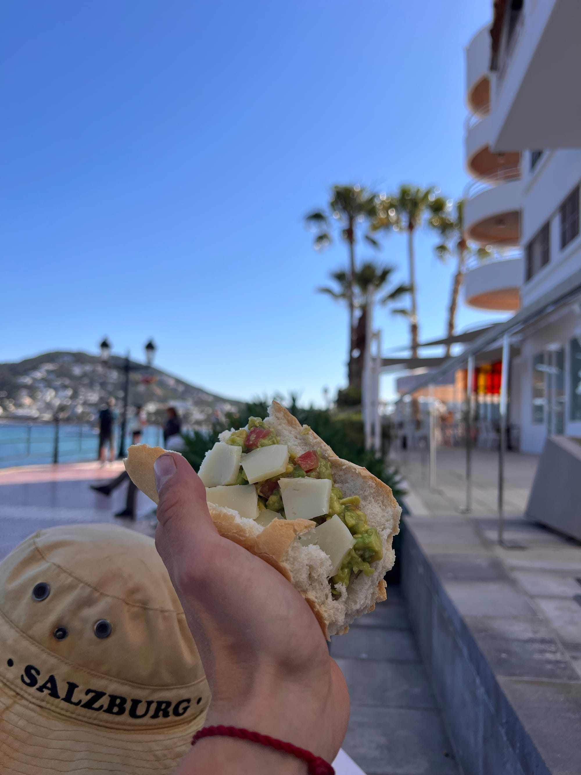 In Eurali, eine Stadt die anscheinend einen gewissen Geltungsdrang besitzt und deswegen noch vier andere Wortfetzen um seinen Namen herum zu stehen hat, kommen wir in der Nähe eines voll bepackten Strandes heraus. In keiner Welt kann ich mir erklären wieso ich dachte, dass nur Ibiza die Stadt der Touristen wäre, aber ja, so macht das Ganze natürlich viel mehr Sinn. Alles ist voll mit den schönen Menschen, die meisten Briten. Ich versinke in melancholischer Erinnerung an eine besondere Zeit in Kanada. Am Anfang des Jahres gibt es einen Zeitraum von zwei Wochen, zu dem man in einer Stadt nicht weit entfernt von wo ich wohnte, hunderte von riesigen und schwerfälligen Seehunden beobachten konnte, wie sie ganze Stege und Häfen belagerten und deren imposante Rufe dem Duft ihrer Scheisse würdig wurden. Sie belagerten alles und füllten mit ihren unförmigen, gigantischen Körpern die letzten Ecken aller Holzdielen aus, genauso wie es nun ein paar ganz besondere Individuen vor mir taten. Ach, das schöne Kanada. Wären Briten nicht so unglaublich freundlich, dann würde ich mir beinahe Seehunde statt Menschen an den Stränden wünschen. Wir setzten uns auf eine steinerne Bank die um eine kurze führte und während Martin sich ins Zeug legte um eine gefangene Avocado in Stücke zu hacken und sie dann mit Tomate und Salz zu einer Guacamole zu vereinen, machte ich mich auf die Suche nach Restaurants, die vielleicht die Ehre hätten eine alte gebrauchte Gabel an mich zu verkaufen. Es klingt doof, aber die dafür nötige Kapazität schien keines der umliegenden Gastronomien zu besitzen und ich wurde stattdessen mit billigem Plastikbesteck abgespeist. Ja schönen Dank auch! Die Guacamole schmeckte aber auch so hervorragend. Martins Messer hatte gute Arbeit geleistet und wir leisteten ebenfalls starken Einsatz, als es zum verspeisen des Brotes und des tollen Aufstriches kam. Belustigt und mit Mitleid beobachteten wir die Menschen die an uns vorüber zogen und die sichtlich verzweifelt darüber schienen, wie all das Geld, welches für den Urlaub nötig war, sie weder so glücklich noch so reich beschenkt an guter Nahrung machte, wie es für uns der Fall war. Für ein paar Momente hatten die Reichsten der Welt unser Herz und wir wollten sie grade trösten, aber dann fuhren sie mit ohrenbetäubenden Lärm auf ihren Jetskis sitzend davon. Das mit den Jetskis ist nicht gelogen, genau vor uns war ein Bereich zum Einlassen und daneben ein Kajakverleih auf dessen Ware ich größte Lust gehabt hätte, aber anscheinend fühlten wir uns nicht bereit genug dafür. Wir aßen und machten uns dann auf den Weg den 13 Kilometer entfernten zweithöchsten Berg der Insel, den Sa Torreta, zu besteigen. Wir durchquerten wirklich wunderschönes Umland mit kleinen Farmen und den auf ihr wohnenden Familien. Wir fanden unsere ersten beiden Avocado Bäume und sangen mit den kleinen Kläffern an ihren Toren um die Wette. Als wir an einem besonders schönen Grundstück mit schöner Waldanlage vorbei kamen, sahen wir eine Wiese voller goldener Heuballen auf rötlichem Ackerboden liegend, vor uns ausgestreckt. Wir platzierten uns reichlich erschöpft auf einem der Ballen und verzehrten das was uns an Essen noch übrig war. Danach setzten wir uns auf den Boden und meditierten zusammen, wobei ich Martin meine erste jemals geteilte Guided-Meditation vortrug. Blablabla ;’)
