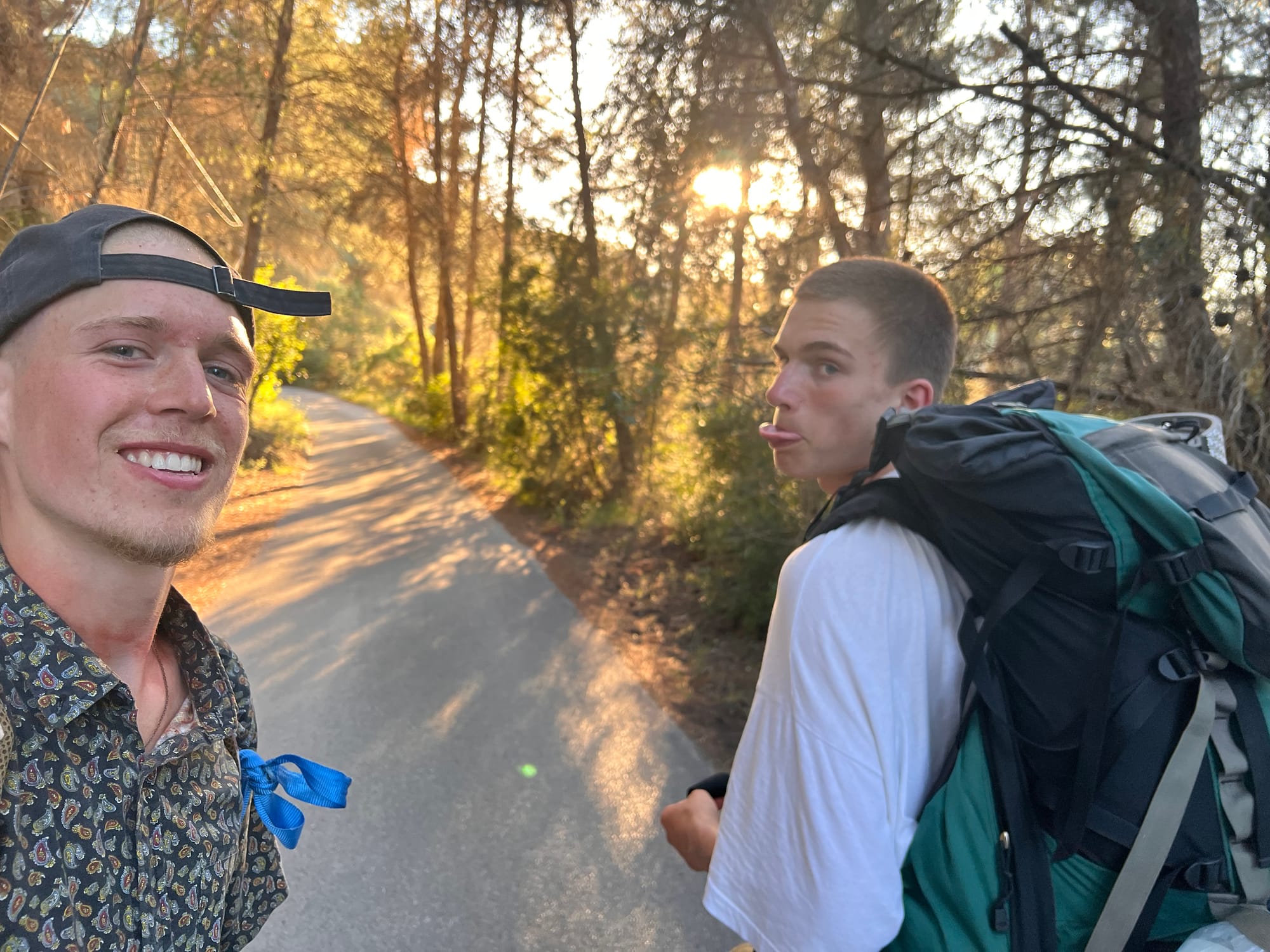 Auf einer Isomatte sitzend beobachte ich die Straße 30 Meter vor mir und den neben ihr platzierten, auf einer Anhöhe sitzenden und schreibenden Martin. Fünf Straßenlaternen schmücken das Ambiente mit grell-gelben Licht und tauchen die Wiese mit ihrem goldenen, nun durch die Nacht vergrauten wilden Gras einem Getreide gleich, in leichten Schimmer. Der Wind fährt sachte durch die Halme und streicht meinen Nacken, der vorne wie hinten seine Marken der gleißenden Sonne trägt und durch meine nun kupferfarbene Kette mit dem spitz zulaufenden Dreieck rötlich gefärbt ist. Mein Oberkörper hat ein weißes Tanktop an sich und wird zusätzlich von meinem schwarz-violetten Strickpulli bedeckt, welcher zusammen mit der weißen Leinenhose, an der rechten Seite zum Fuß hin 30 Zentimeter gerissen aber mit Stoff aus Kanada vernäht, ansonsten mit diversen chinesischen Hanzi-Charakteren geschmückt, welche alle rot und blau auf Hinter- und Vorderseite verteilt sind, die Gänze meines Outfits darstellen. Die Schuhe sind Barfußschuhe und die Socken durchgelaufen und löchrig. Der Hut ist die blaue Kappi von der wundervollen Glenora Farm Camphill Community aus Kanada, Vancouver Island. Unser Gepäck benachbart die Matten auf der ich sitze, und meine power Bank lädt mit ihren 20.000 mA mein iPhone 13 Pro. Mein schwarzer Rucksack steht zu meiner linken, gefüllt mit ganz oben zwei Zahnbürsten, kleiner Edeltubepaste, Nagelknipser, normalerweise Klopapier und Rasierklinge. Zwei Wasserflaschen und eine Tuperdose mit Erdnüssen, Karotte, Crackers, ein peanut butter Glas, Haferflocken und drei feinste Plastiktüten mit drei Äpfeln, zwei Birnen, Pflaumen, Pfirsiche und Apfelsine, Seetang steckt in der zwischen Tasche zum Rücken hin. Meine große Tasche mit dem ockergelben Camouflagemuster hat ganz oben im Deckel erste Hilfe, feuchte Tücher, Taschentücher und ein weißes 3 Meter Seil. Im Innenraum ist sonst die schwarze Tasche und alle Klamotten, also meine blau-weiß karierte Wolljacke, mein Poncho aus Südamerika geschenkt von Beet Willam Turnipseed, zwei Sockenpaare, zwei Unterhosen, Weite mit Karos die blau pink gelb und weiß sind, die andere mit Streifen die weiß schwarz und rötlich lila sind, ein langes Hemd mit der Aufschrift Champions auf weißem Hintergrund, ein Leinen Hemd mit drei Buchstaben L B T im Brustbereich, meine bandana, falls ich sie nicht verloren habe, zusammen mit dem coolen Hemd dass dieselbe Symbolik auf sich trägt wie eben jene Bandanna. Weiter vorne in dem Rucksack findet sich mein Sketch-Buch von meiner Kanada Familie geschenkt, mit Zeichnungen der Schattierung, unseres Hauses und Familie, Ausblicken von Norwegen und Brunnen, die angefangene Karte meiner Heimatstadt, Bilder von Joses Zimmer Aussicht in Alicante, Orte mit lila Bäumen und Fisch gefüllte Wasser bei denen ich mit Martin saß und bald hoffentlich noch viele weitere visuelle Erinnerungen. Die vorderste Tasche am unteren Ende beinhaltet das Buch ‘Natur’ und kleine Erinnerungen wie Bilder aus verlassenen Häusern und eine ausgedruckte Zeitungsseite mit Martin und mir drin.