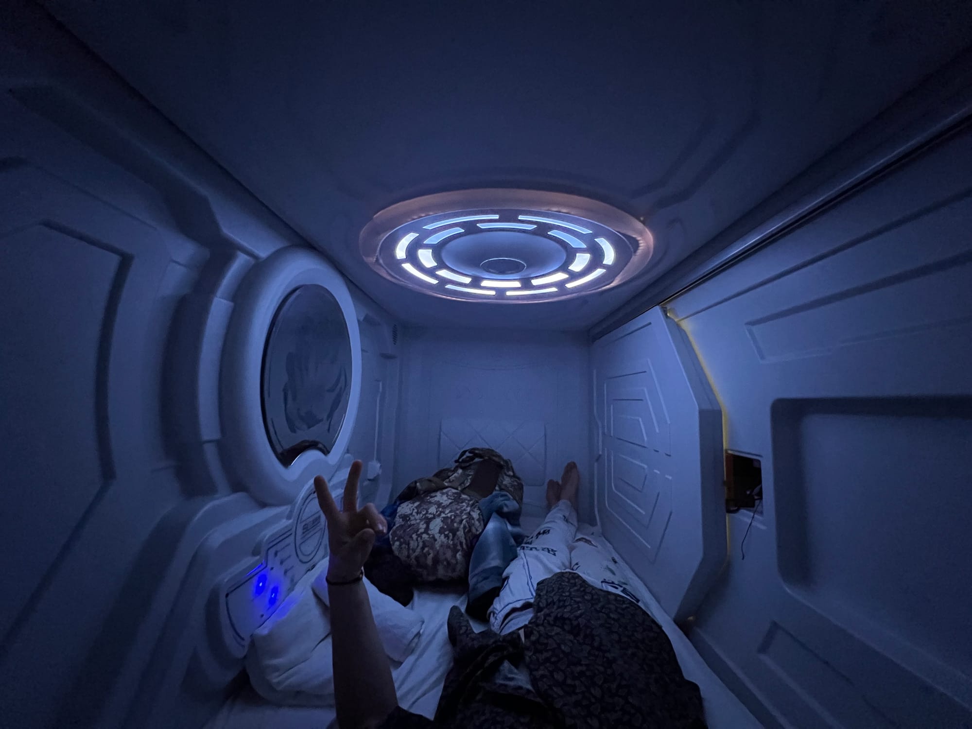 Das Hostel trägt den Namen ’Just Capsula’ und wirbt anscheinend mit kleinem Schlafplatz für große Preise, mit dem Deal, dass die Koje aussieht wie eine Astronautenkapsel oder so ähnlich. Von einer Person am Schalter werde ich um ein Uhr nachts eingewiesen und besteige meine im zweiten Stock gelegene Nachtstätte durch eine kleine weiße Schiebetür, die nicht jede Person passieren könnte; es war wirklich wie ein kleiner weißer Plastiksarg. Ich bin unwissend genau über Martin’s Bett zu liegen, da alle Betten kleine abgeschottete Kästchen sind mit LED-Armaturen im Innenraum die auf chinesisch erklären, was welcher Knopf denn so tun würde, wenn man sich dazu herab lässt sie zu drücken… leider übersteigt das mein Level des Vokabulars - nach vier Monaten Mandarin ist man überraschend wenig weit mit der Sprache und die Hanzi-Charaktere gehen bei mir sowieso noch gar nicht.