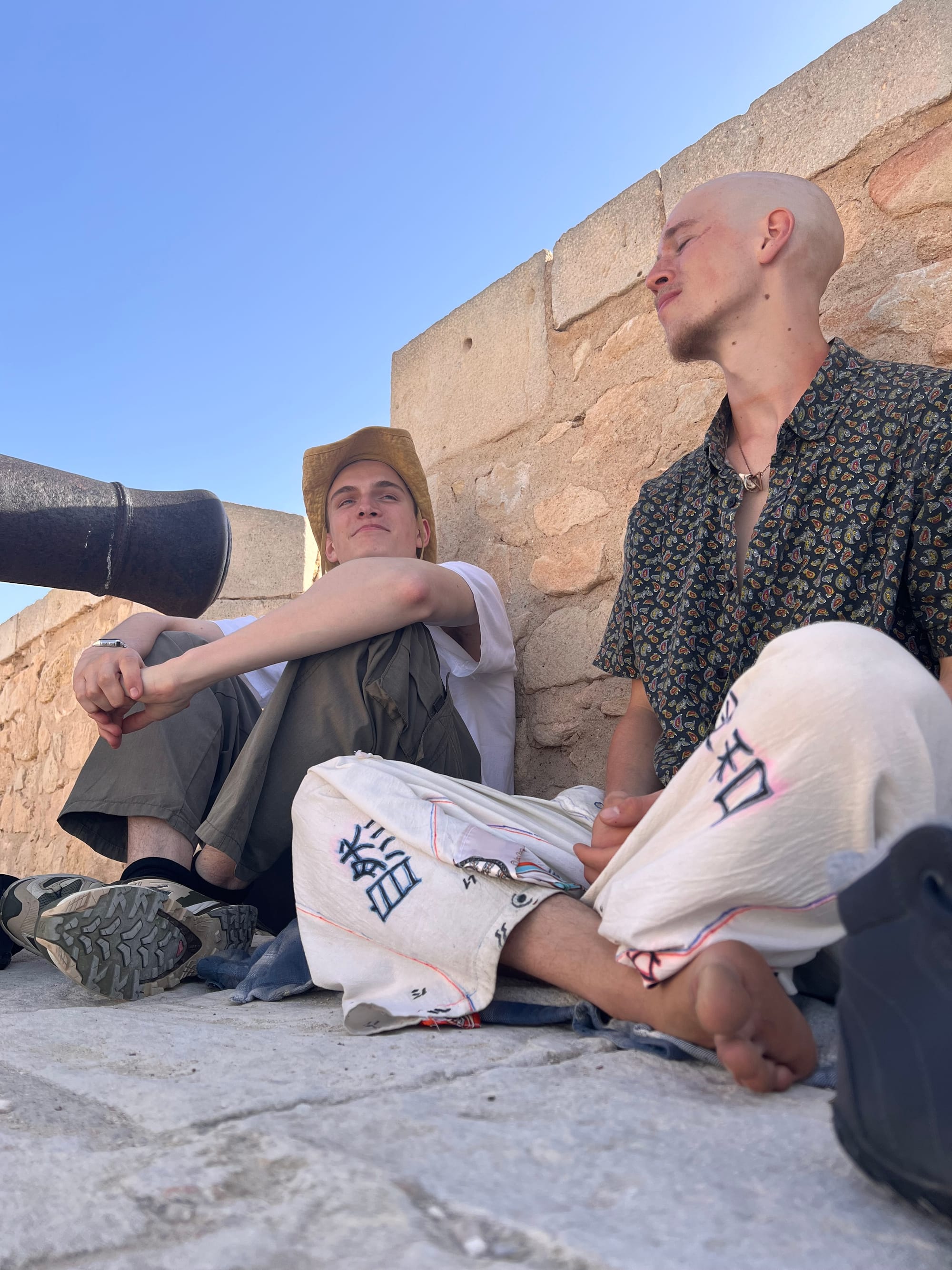 Ich dachte mir die ganze Sache so: vier Tage meiner Seits an einem tollen Ort wie Alicante fühlten sich nach genug an, um eine optimale Strecke mit möglichst viel Schönem kreieren zu können und ihm im Schnelldurchgang das Schönste präsentieren zu können. Dementsprechend wurde unser erster Tag direkt ein sehr laufintensiver, als wir uns von Gasse zu Gasse, von Aussicht zu Aussicht und von städtischem Urwald in seichte Hafenwässer verirrten. Meine liebsten Dinge kreuzten den Weg, so zum Beispiel der Nispero-Baum oben auf der Castello de Santa Barbara, von welchem wir im Huckepack ein paar Früchte pflückten. Die Straße der Innenstadt mit riesigen Fliegenpilzen an allen Seiten, der Ramschladen neben dem China-Store, welche beide für ihre Diversität und ihren Vibe besucht wurden. Martin und ich redeten viel, aber nicht alles auf einmal. In einer gesunden Waage aus Stille beim Bewundern und Philosophieren schienen wir die kommenden 2.5 Wochen gut im Gefühl zu haben und passten das Gesprochene an, was nicht heißt, dass nicht viel gequatscht wurde. Mein wundervoller Martin ist übrigens das Spanisch-Ass von uns beiden. Überragende Duolingo Künste und mehrere Online-Kurse verzauberten angesprochene Passanten im Nu und problemlos losten wir uns durch die Stadt ohne die Hilfe einer Karte. Ein schönes Andenken, welches uns vermacht wurde, war ein Zweiertrupp aus Studenten, welche mit einer Photobox aus Pappe nachgestellt, Bilder von Menschen machten und mit einem Drucker sofort produzierten, was aussah wie eine Zeitungsseite mit dem eigenen Bild darauf. Der niedliche junge Mann mit Lockenhaar und netter Brille, überreichte uns das Bild und erwartete kein Geld dafür, sondern wünschte uns nur nett alles Gute. Kurz darauf versuchten wir unser Glück indem wir einen Bankwärmer in Form eines ebenfalls jungen Menschens in der Nähe des schönsten Gartens der Stadt ansprachen. Wir lernten jenen kurz kennen, ein Pole der eine einjährige Weiterbildung hier in Alicante genoss und trotz seines festen Standpunktes genauso verloren in der Welt schien, wie wir beide es waren. Kurz darauf stoßen zwei hübsche Damen im selben Alter dazu, seine Kolleginnen, und sie klauen uns den Gesprächspartner, weil ein Restaurant auf sie wartet. Am Garten selbst sprechen wir mit drei jungen Britinnen. Eine von ihnen scheint ziemlich kaputt von ihrer Nacht zu sein, aber super freundlich mit schönen silber-grauen, tiefliegenden Augen und mit Erdbeeren, die sie mit uns teilt.